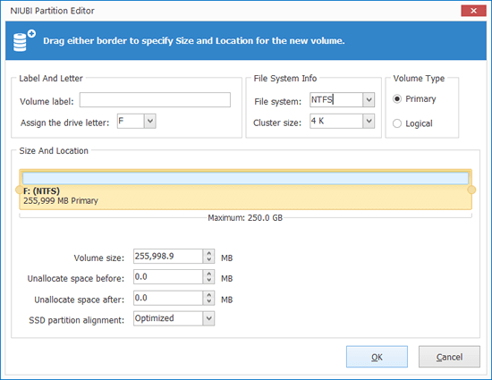 To convert Unallocated space to NTFS/FAT32 partition, you just need to right click this Unallocated space and select "Create Volume". In NIUBI Partition Editor, you can select partition type, file system, cluster size, add/modify partition label and edit partition size/location easily.